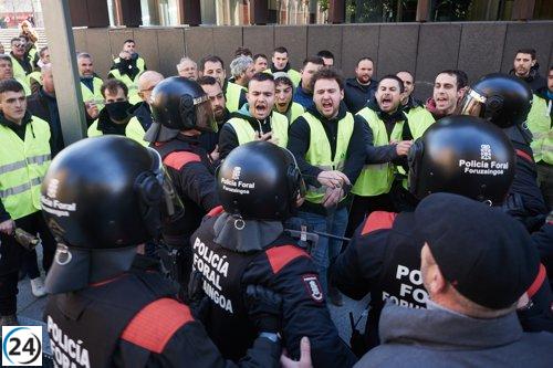 La policía carga contra agricultores protestando frente al Parlamento navarro.